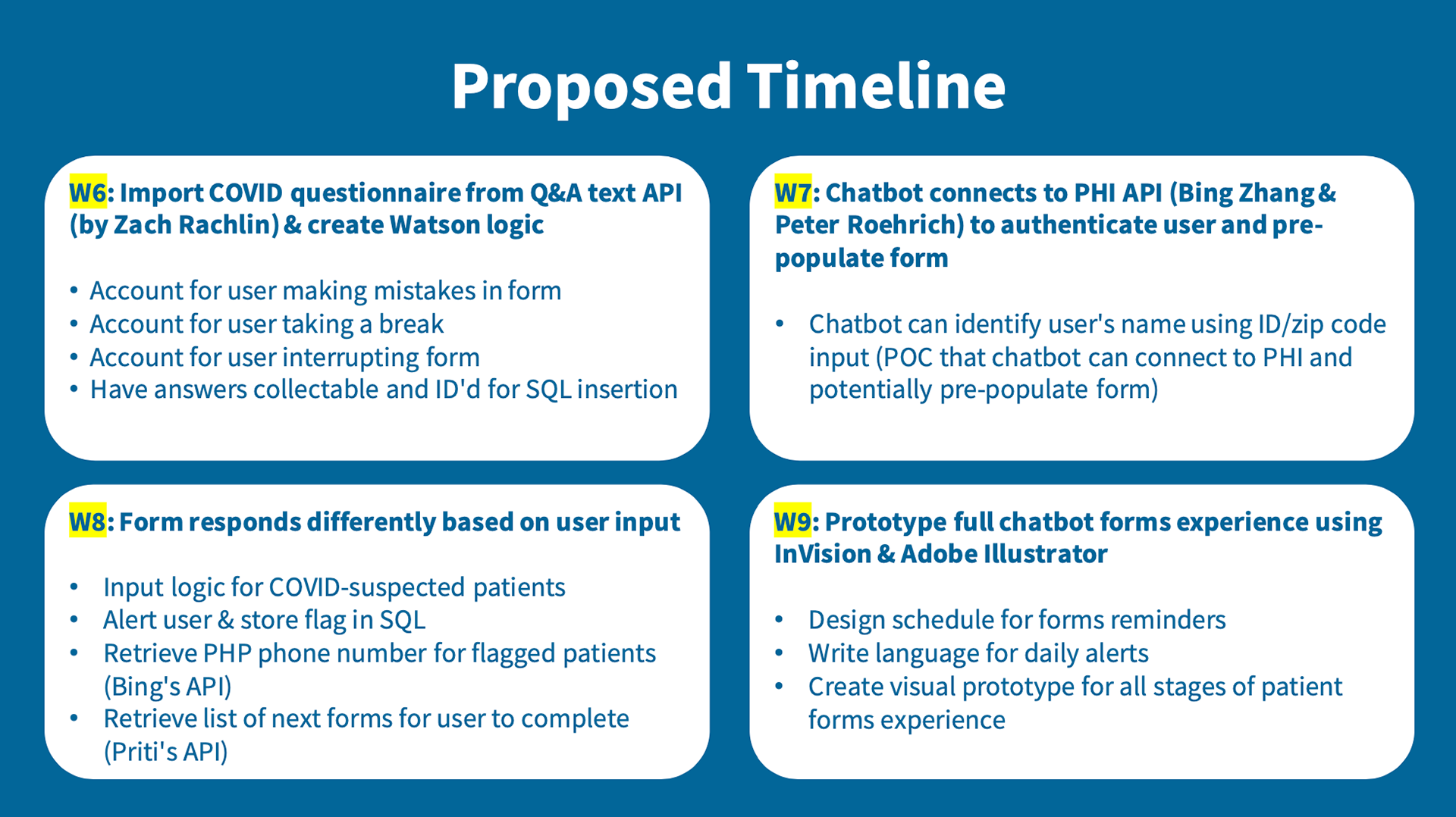 I came up with this idea of a comprehensive patient “assistant” as an application of IBM Watson and a model for MSK’s future patient-system interaction. Specifically, I wanted to work on developing a proof of concept and prototyping a conversational agent that could transform the patient’s survey experience, as cancer patients interact with so many surveys before, during, and after each visit that it causes what we called “patient burnout.”